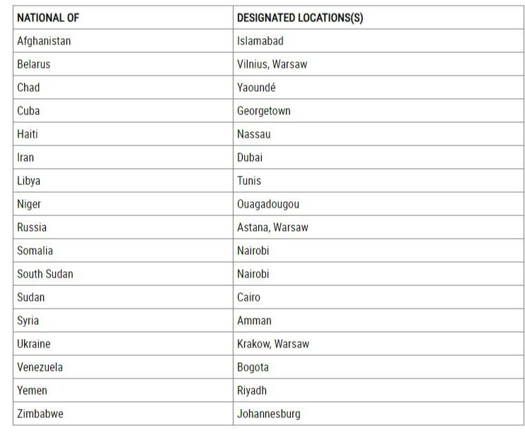 Для стран, где американские консульства не проводят собеседования (Россия, Беларусь, Украина и другие), Госдепартамент назначил конкретные места для прохождения интервью.