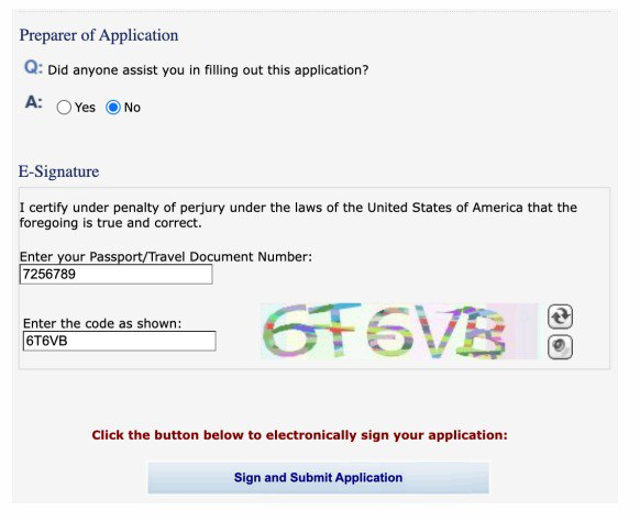 Перед отправкой: укажите, кто помогал заполнять анкету, внесите данные загранпаспорта и код с картинки, затем нажмите Sign and Submit Application — после этого изменить анкету уже нельзя.