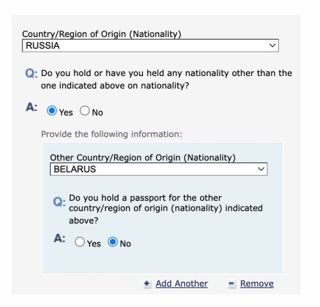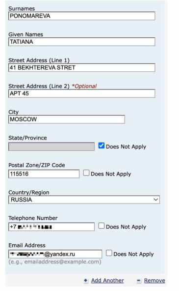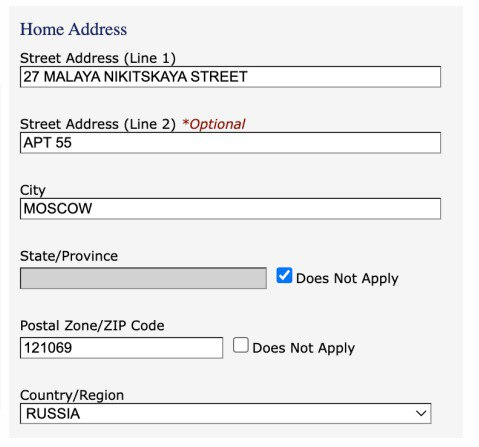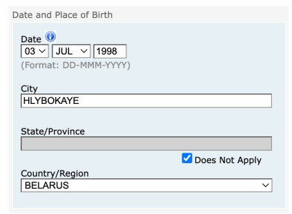State/Province – штат/провинция. Верного ответа на вопрос, стоит ли вписывать область в это поле, нет. Кто-то вписывает, кто-то ставит галочку Does Not Apply/Не применимо. Страна рождения (актуальное название страны. Например, если это Белорусская ССР, то страну рождения выберите Беларусь).