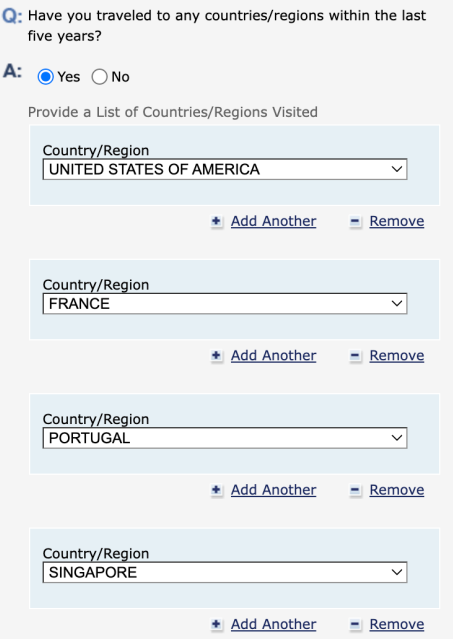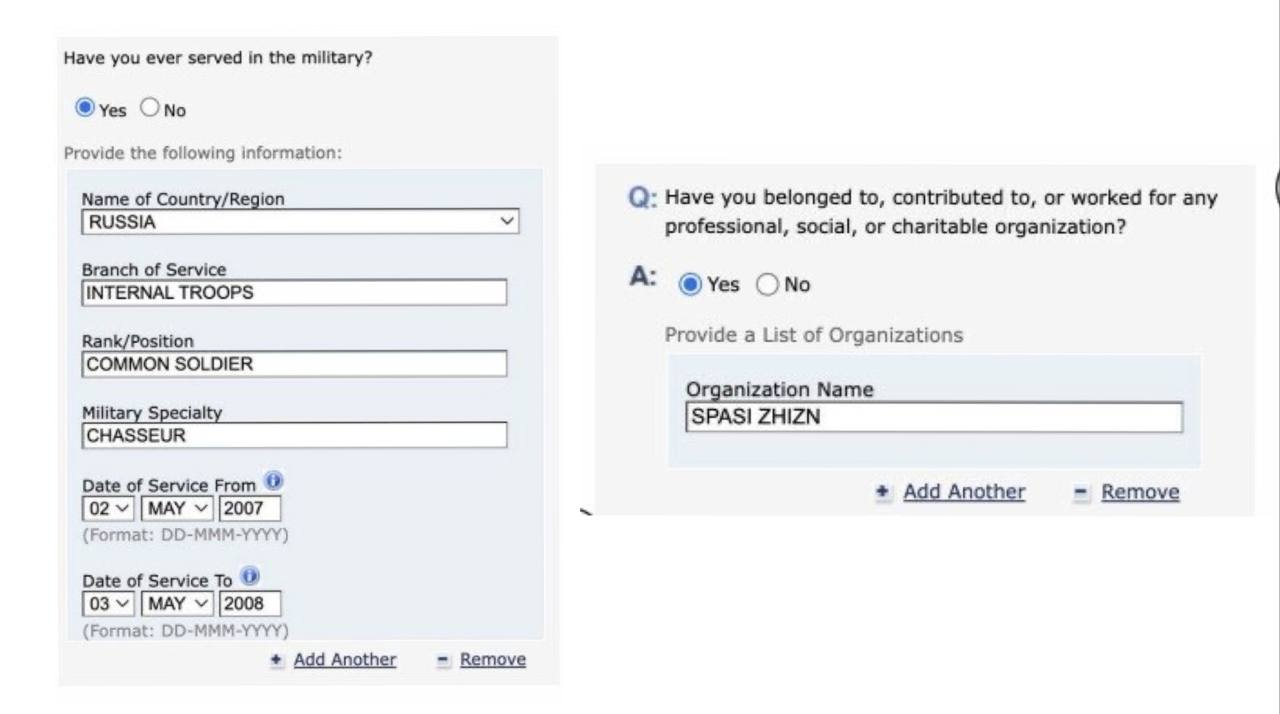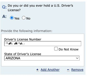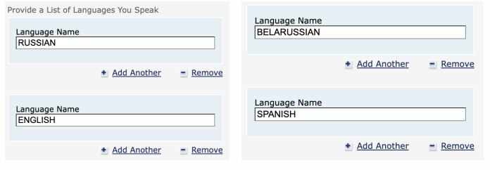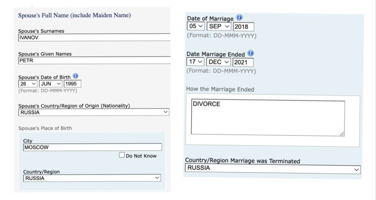 Если вы в разводе, в анкете нужно указать данные бывшего супруга или супруги. В Number of Former Spouses потребуется указать количество бывших супругов (например, 1) и нажать кнопку Add Another, чтобы добавить дополнительные строки. Для каждого брака нужно вписать дату его заключения и дату расторжения.