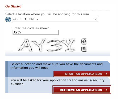 Страну в этот раз можно не выбирать. Место проведения собеседования автоматически останется тем же, которое было выбрано при создании анкеты. Позже его можно будет изменить. Ниже на странице введите код с картинки, а затем нажмите кнопку RETRIEVE AN APPLICATION/Восстановить анкету