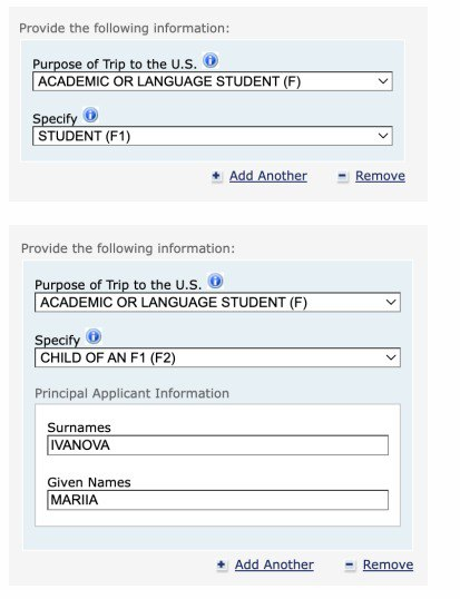 Purpose of Trip to the U.S. В качестве цели поездки для обучения выбирается вариант Academic or Language Student (F) и тип визы – F-1. Если анкета заполняется для сопровождающего члена семьи (супруга(и) или ребенка), тогда выбирается тип визы F-2.