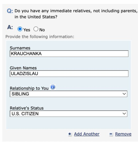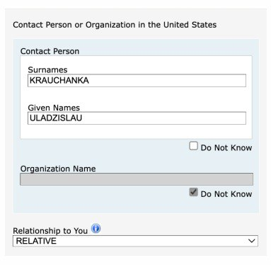- Если у вас в США есть близкий родственник – жених или невеста, муж или жена, ребенок, родитель, родной брат или сестра – в анкете нужно указать их имя и фамилию, степень родства и статус в стране из списка вариантов.