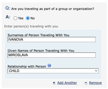 Укажите, едет ли кто-то с вами в США. Если поездка с семьей (супруг/а или ребенок), внесите их данные даже при других типах виз.