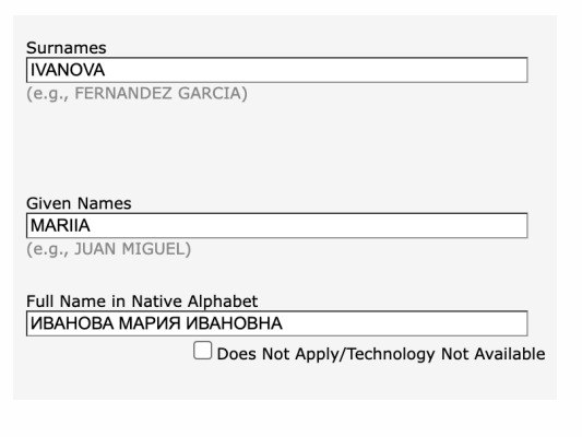 Если не можете ввести имя на родном языке или оно полностью совпадает с латинским написанием, отметьте Does Not Apply / Technology Not Available.