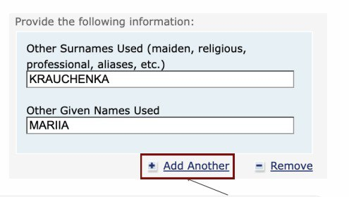 Если было несколько предыдущих имен/фамилий, нужно добавить новое поле через кнопку Add Another (с плюсом) и вписать туда дополнительные данные.