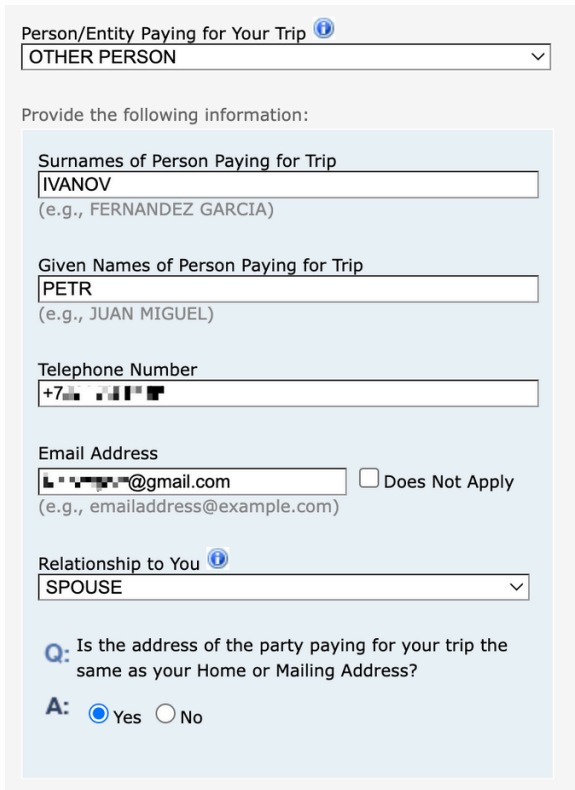 Далее нужно указать, кто спонсирует поездку. Чаще всего оплата идет либо от самого заявителя, либо от родственника, либо от работодателя (особенно в случае получения визы F-1).