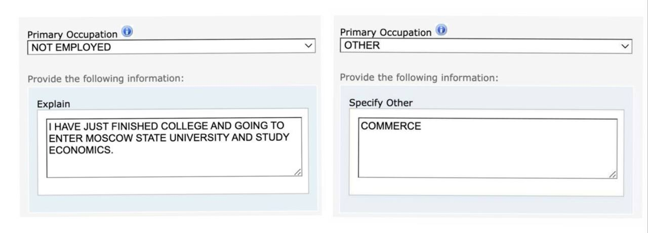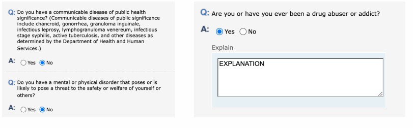 В большинстве случаев на эти вопросы отвечают No. Если выбираете Yes, появится поле для краткого описания ситуации.