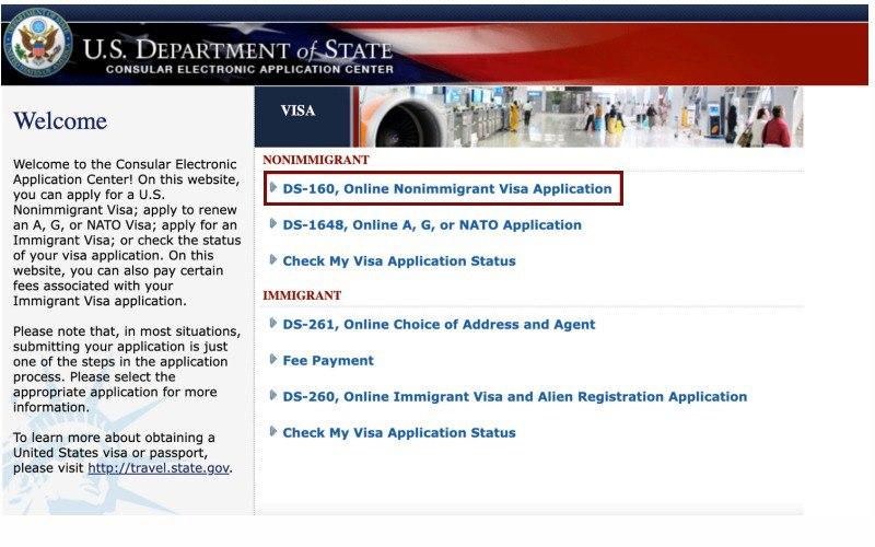 - Выберите опцию: DS-160, Online Nonimmigrant Visa Application