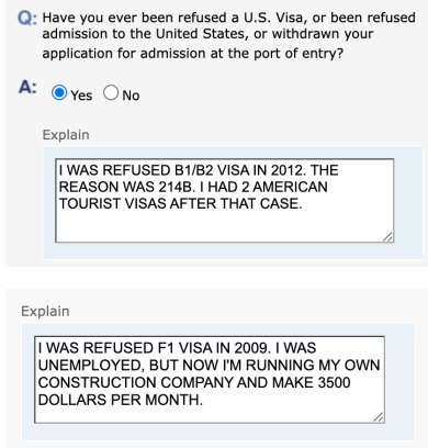 Если вам когда-либо отказывали в визе США, в анкете нужно будет указать причину отказа. Например, самая распространенная — 214(b), нужно объяснить изменения, которые делают вас надежным заявителем. Пример показываем на картинке ниже.