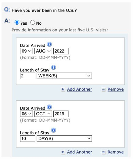 Укажите даты предыдущих поездок в США. Если точные данные неизвестны, можно ориентироваться на билеты и штампы, либо проверить эту информацию на сайте: https://i94.cbp.dhs.gov/I94/#/history-search