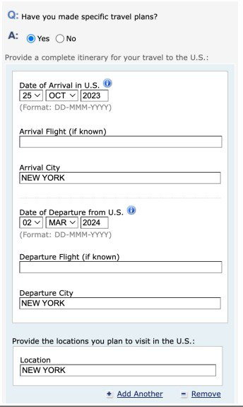 В вопросе о плане поездки лучше выбрать Yes и указать даты прилета и вылета, города и основные места. Для B1/B2 достаточно простого маршрута.
