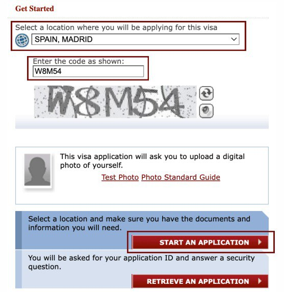 Если пока не знаете, где будете проходить интервью, выберите любую. Потом ее можно будет сменить. Введите код, указанный на картинке и нажмите START AN APPLICATION / Создать анкету