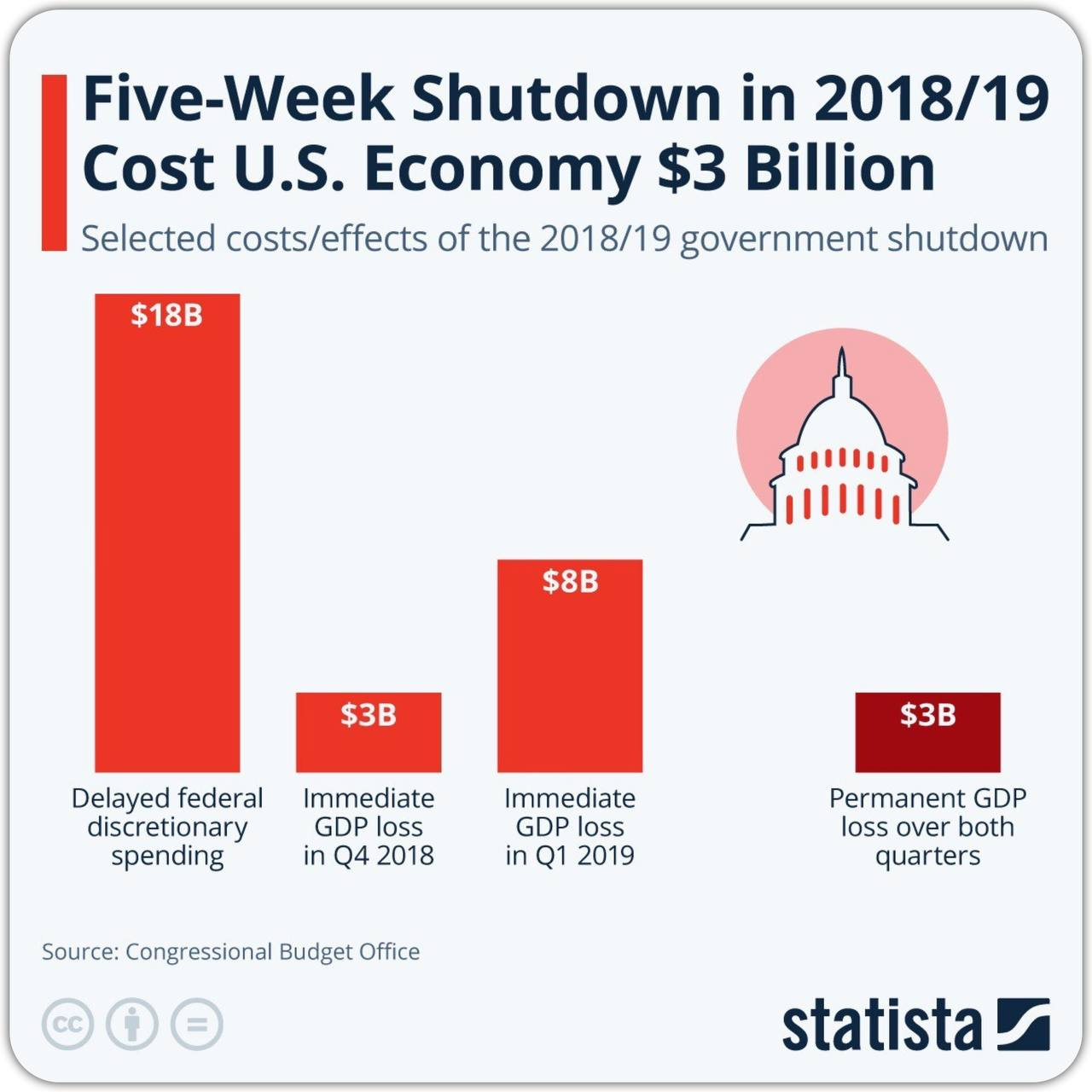 Длительный шатдаун уже сказывается на экономике, снижая темпы роста ВВП, мешая работе социальных программ, служб и инфраструктуры. Еженедельный убыток страны — около 2 миллиардов долларов.
